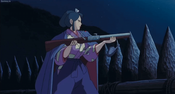 This is from "Princess Mononoke" . The recoil should have pushed it off her shoulder!