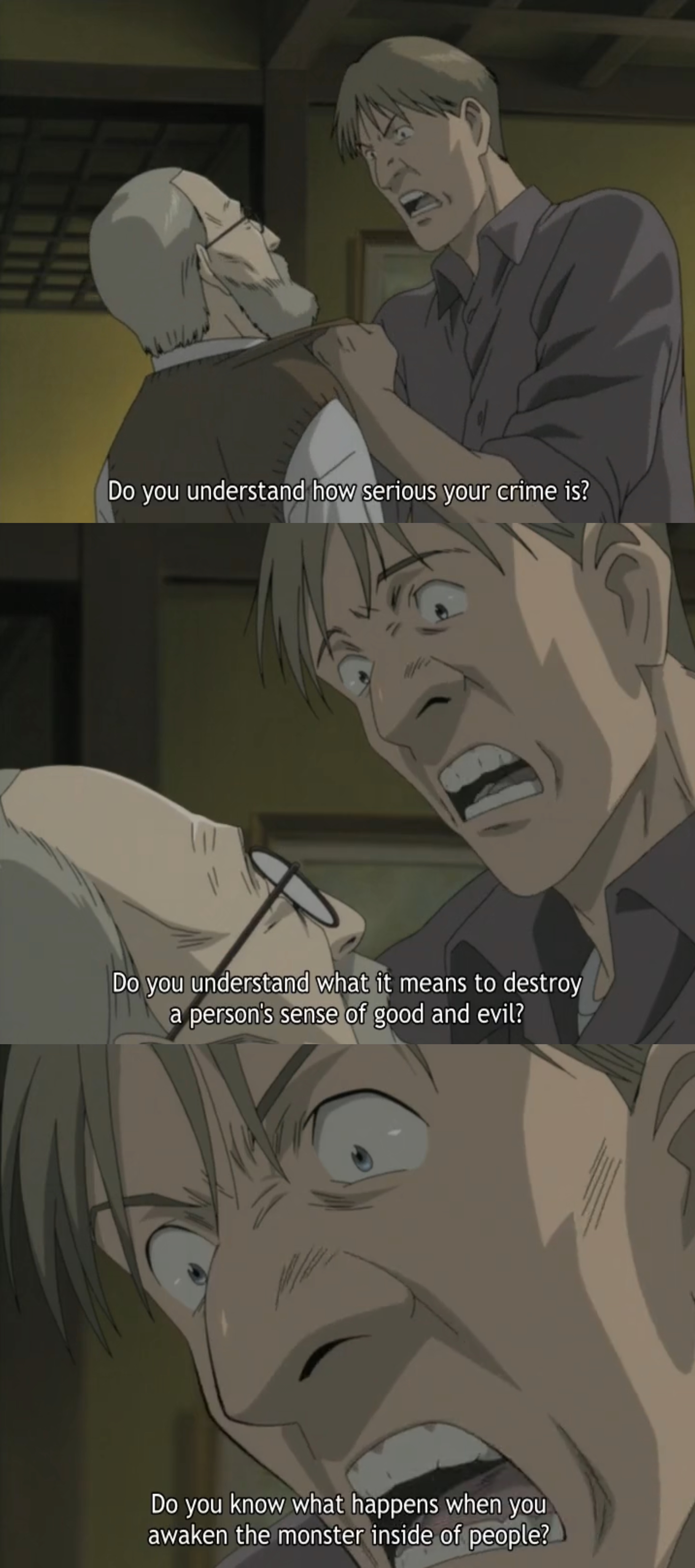 I was shocked to learn the anime is pretty much a 1:1 scene by scene of the manga as well and the dub was also surprisingly good, and I really like both the sub and dub of Monster. Have you read the follow up novel "Another Monster" which kinda explains all the unanswered questions that Monster had and I think even explains where Johan goes at the end?