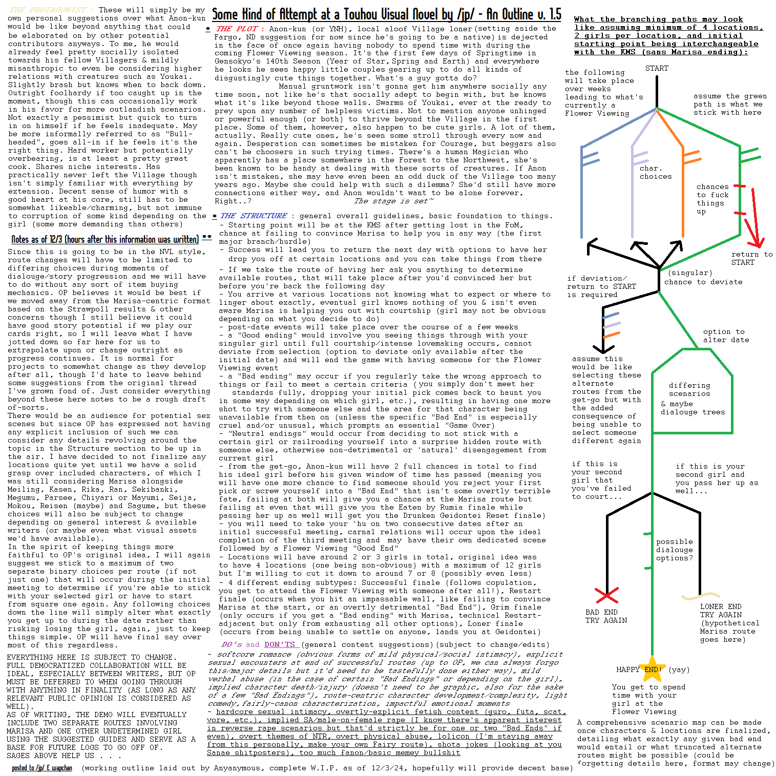 it'll include the basic starting plot, some structural points for mechanics, my own interpretation of what little personality Anon-kun could have, the list of included girls + respective locations, some general suggestions over do's and don'ts when it comes to certain content and an example roadmap over how a given path might go.