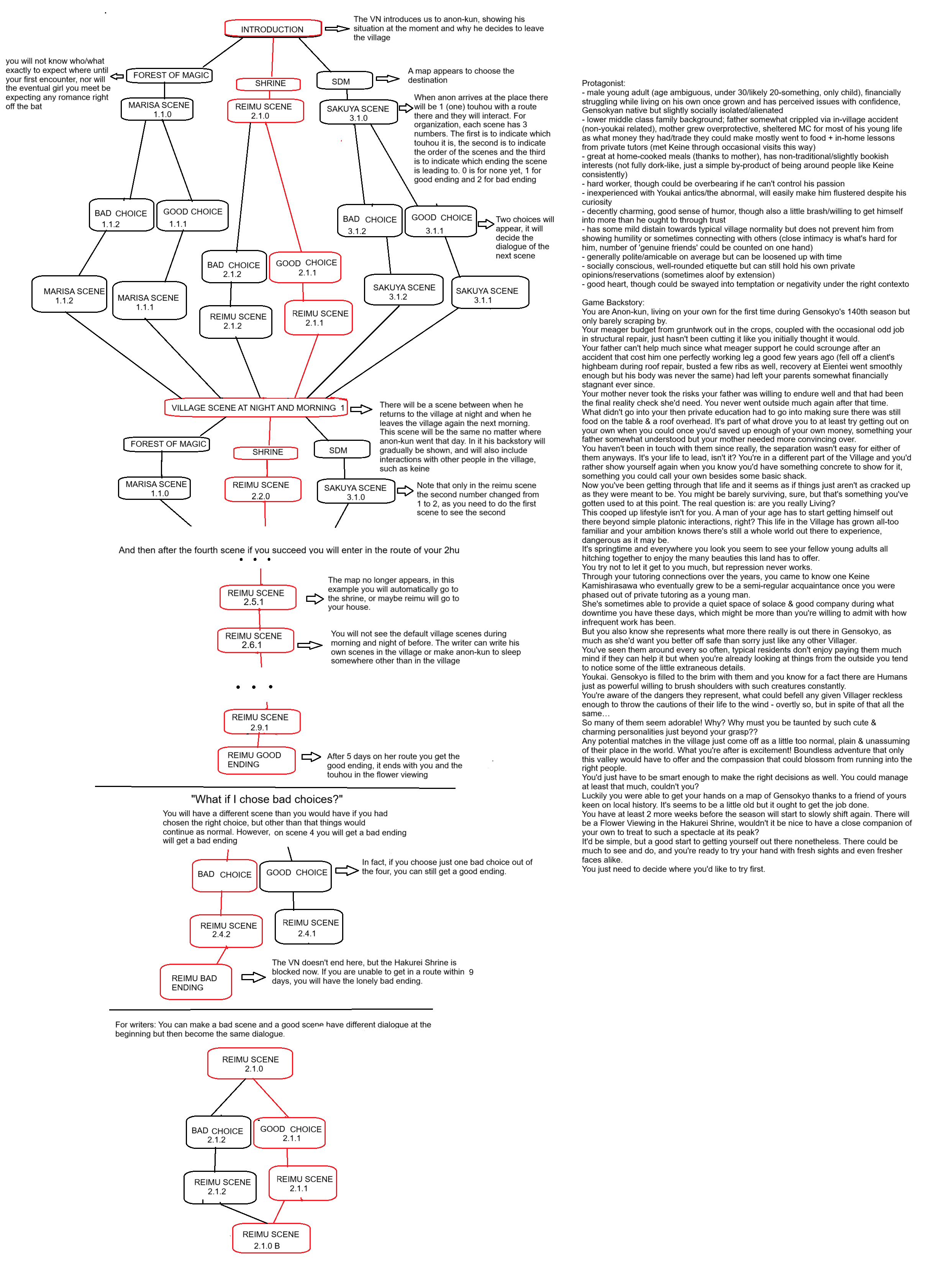 It's a VN dating sim so the protag being male is a given, but it would be good to determine our pov. It doesn't have to be anything fancy and can fit in a sentence: Touhou Gensokyo Visitor's protag is some guy Yukari yoinked from the outside to give Reimu a nice birthday in the form of a little male company. My own project's is a princess maker, so the protag is someone yoinked in to be a test subject for a project of Yukari's and they get trained by her and Ran.