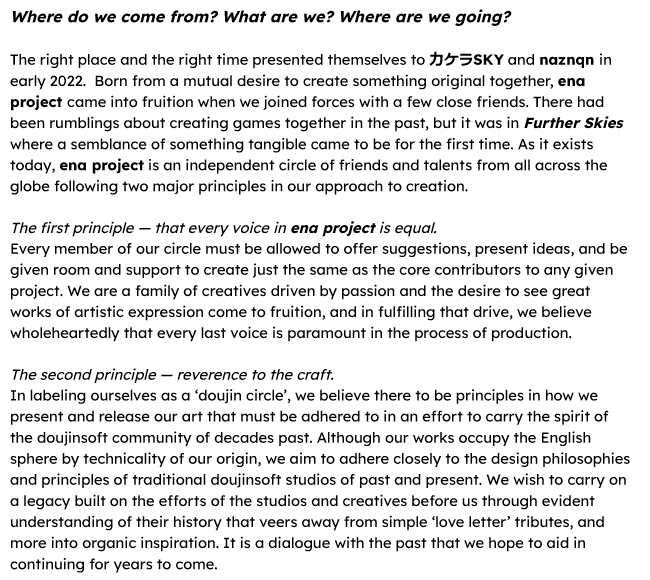 2) Style guide. How the text is to be structured. Do you intend to have long stretches of narration vis-a-vis the kinetic novel format, like in Tsukihime, or short bursts of aforesaid instead, with an emphasis on dialogue and accompanying art, like in a more classic VN? Is the protagonist to speak freely, independent of the player, or is it only to be via the occasional choice box, a'la Blue Archive? And so on. Technical formatting can honestly be sorted out later. This is the least of the problems.