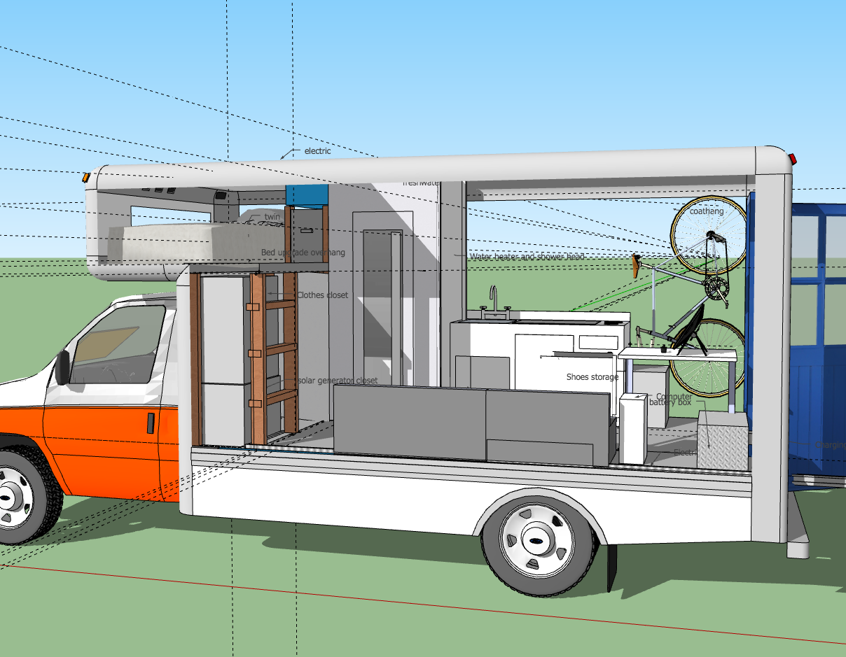 As for my personal plan, I'd want to put the bed in the overhang for space efficiency. The bed otherwise takes up a huge proportion of your very limited space. Batteries need to be slightly raised in case of a water tank breach, and since im a big computer nerd I need a lot of them. I personally don't really need anything more than a single chair. Ideally you can hide both under furniture. Under the sink or the shower is an ideal place for a water tank, and nearby the front of the cabin is the best place for an array of batteries. Solar power is nice and alleiviates the need for roof insulation, but isnt sufficent to charge batteries alone. You need a big, secondary alternator.