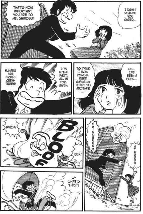 >>673Shinobu's kind of a bad person, and guilty of what a lot accuse Lum of being. She's Rumiko's author's pet so she gets a literal perfect boyfriend to drop from the sky. Notice how Bunny-boy is passive, does everything for her, but Angry Shinobu is constantly abusing him and yelling at him? This is how Rumiko writes her females and why they come off as mega-bitches.