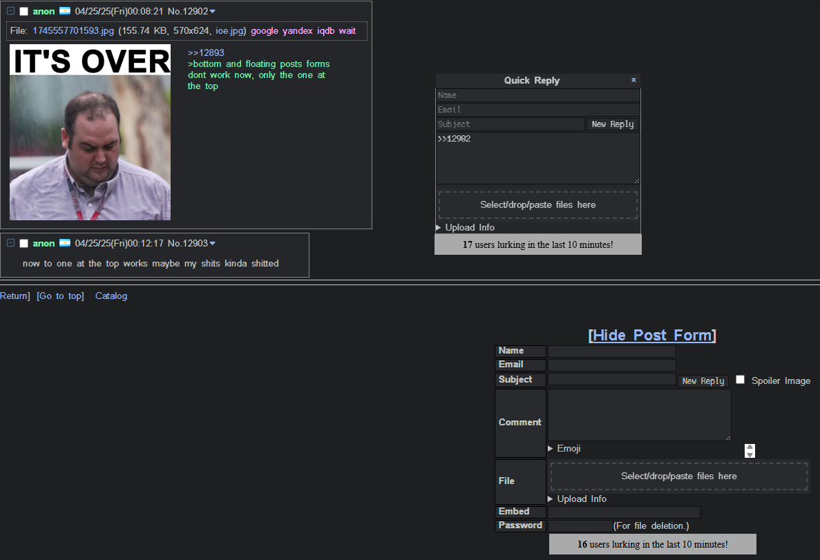 yeah idk famalamadingdong, earlier bug was that quick reply wouldn't work unless you had the top post form open but that was apparently fixed