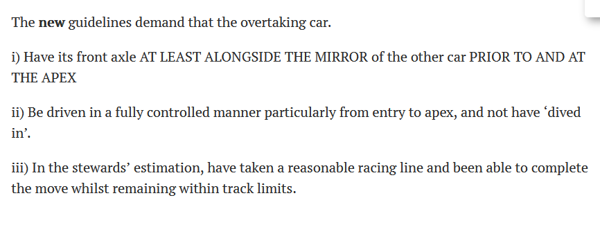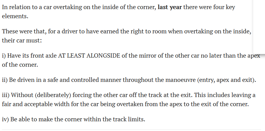 >>14111>In other words, they just legalized running people off the tracki keep saying this is the case. the corner ownership bullshit kills any chance to overtake around the outside because the inside guy isnt obligated to not pretend theres no car there