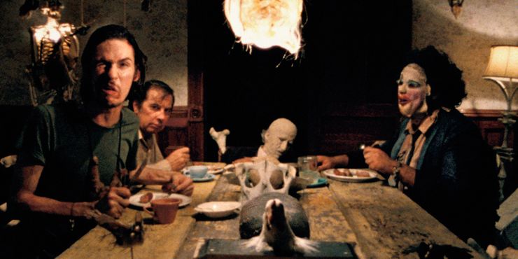I think the idea initially was Leatherface was play-acting being the mother of the family by dressing up and serving food.