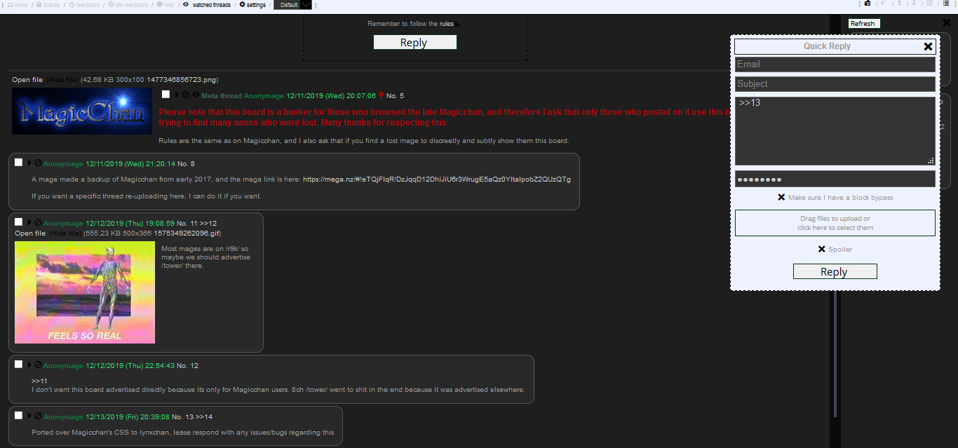 Have not tried using the magicchan bookmark again till today. I am officially a wizard now. Glad modmin decided to create an alt board, I missed magicchan, I was refuging in incels.co but it’s filled with many underage dumb kids.