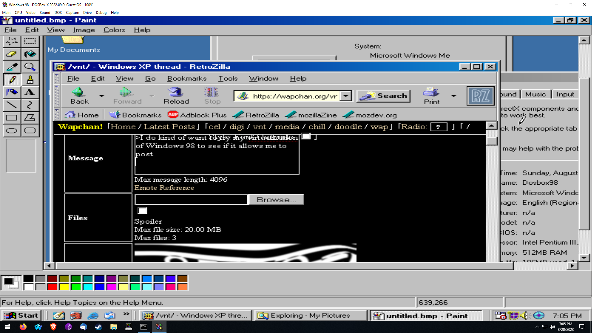 >>337>I do kind of want to try my virtualization of Windows 98 to see if it allows me to postLooks like it works! I can see the captcha.